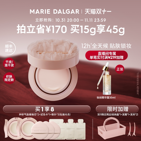 【到手3套:1正2替+试色卡5g+粉扑*3】专为干皮与混干肤质设计,玛丽黛佳种籽气垫2.0升级配方,上妆服帖不卡粉,带来自然柔雾妆效。添加保湿成分,帮助肌肤维持水润状态,同时具备防蹭防汗特性,持妆更安