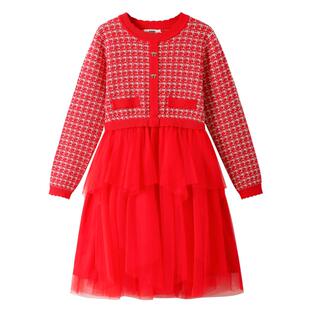 【新年红】安奈儿童装女童连衣裙2025春中国风拼纱甜美保暖裙子