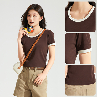 热风女装25年新款夏修身修身上衣撞色印花短袖t条纹圆领辣妹装